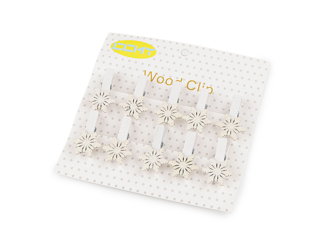 Drevené štipce s vločkou štýlovo ozdobia darčeky, darčekové tašky alebo kvetináče a kvetinové väzby. Sú vhodné aj na výrobu adventného kalendára. Vločky sú pokryté trblietavými glitrami .