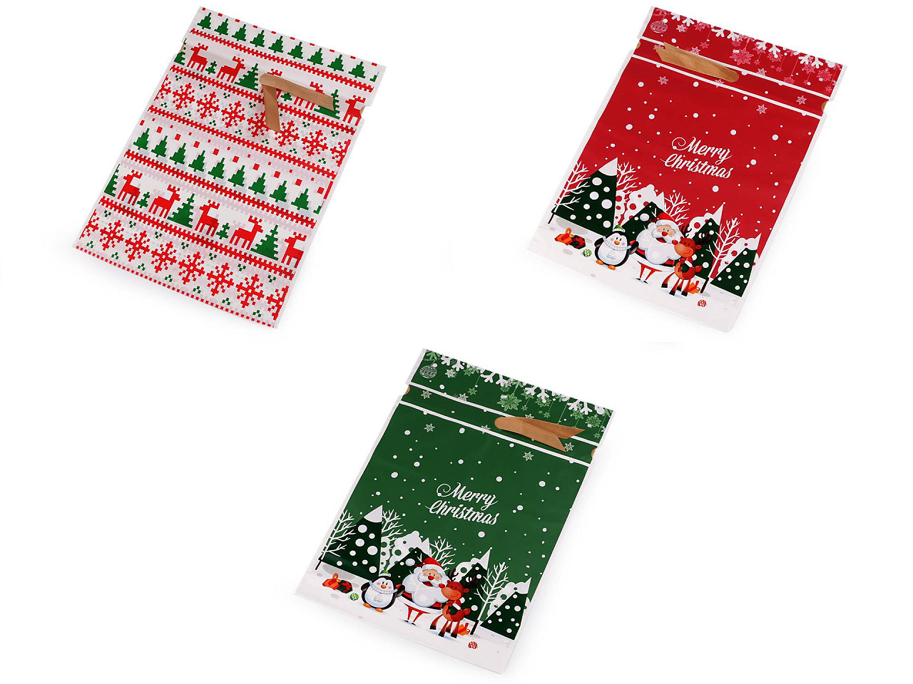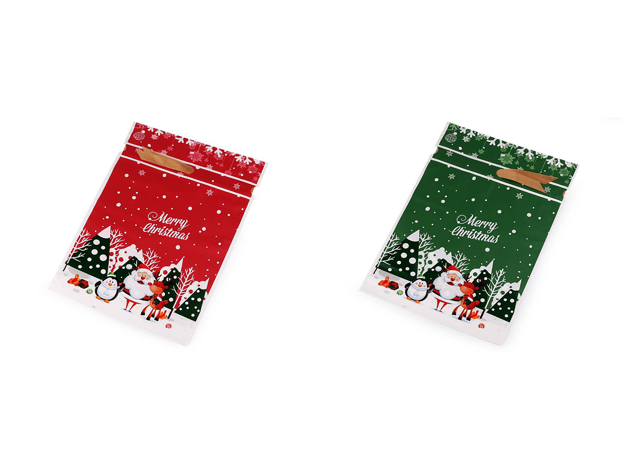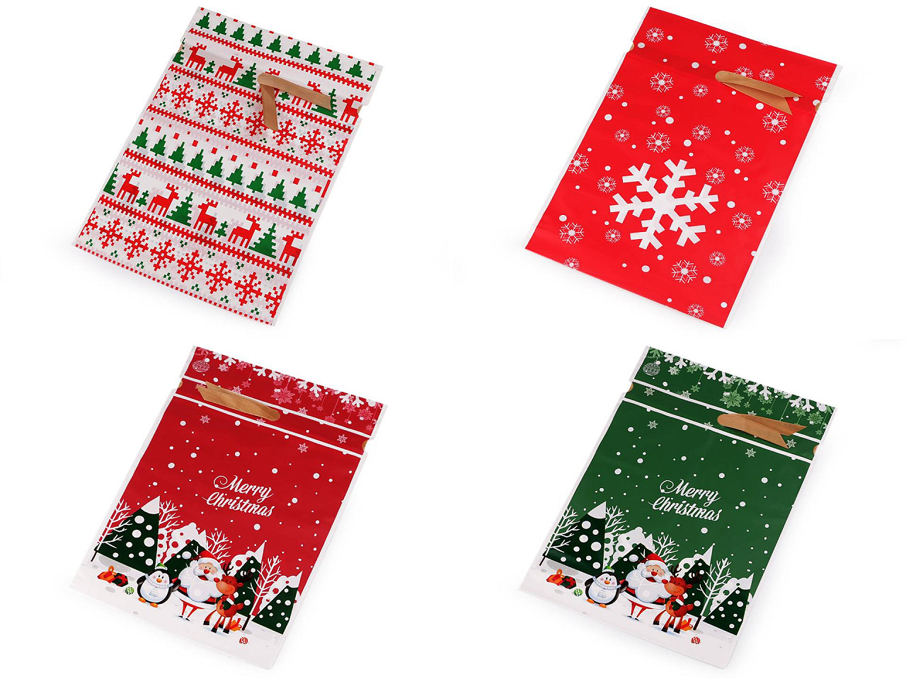 Veľké sťahovacie vrecká s vianočnými motívmi sa skvele hodia na darčekové balenie rôznych balených pochutín, ale tiež napríklad kozmetiky, sviečok a iných maličkostí . Sťahujú sa pomocou saténovej stuhy . Vrecká sú matné, zdobené potlačou z oboch strán. Majú rozšírené dno. Výška vrecka po stuhu je 24 cm. Rozmery variantov sa môžu ľahko líšiť.