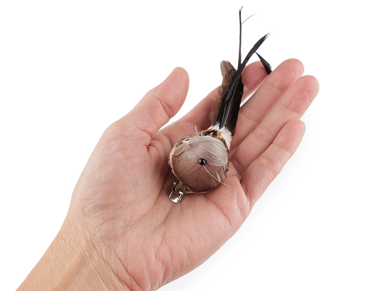 Dekoračný vtáčik zaujme svojim jemným spracovaním a prírodným vzhľadom. Vynikne na vetvičkách, záclonách, vencoch, v kvetinových väzbách a rôznych aranžmánoch. V dolnej časti má kovový klip, ktorý umožňuje jednoduché pripevnenie.