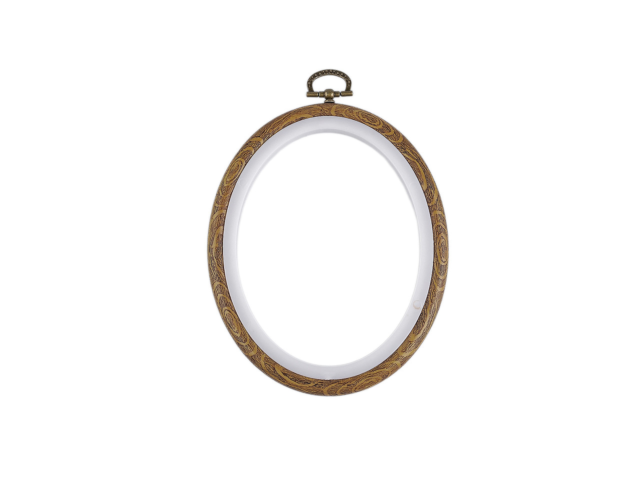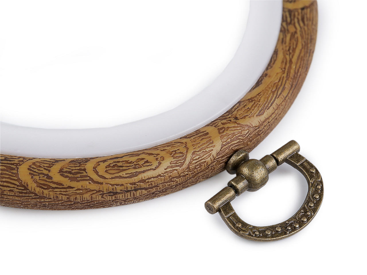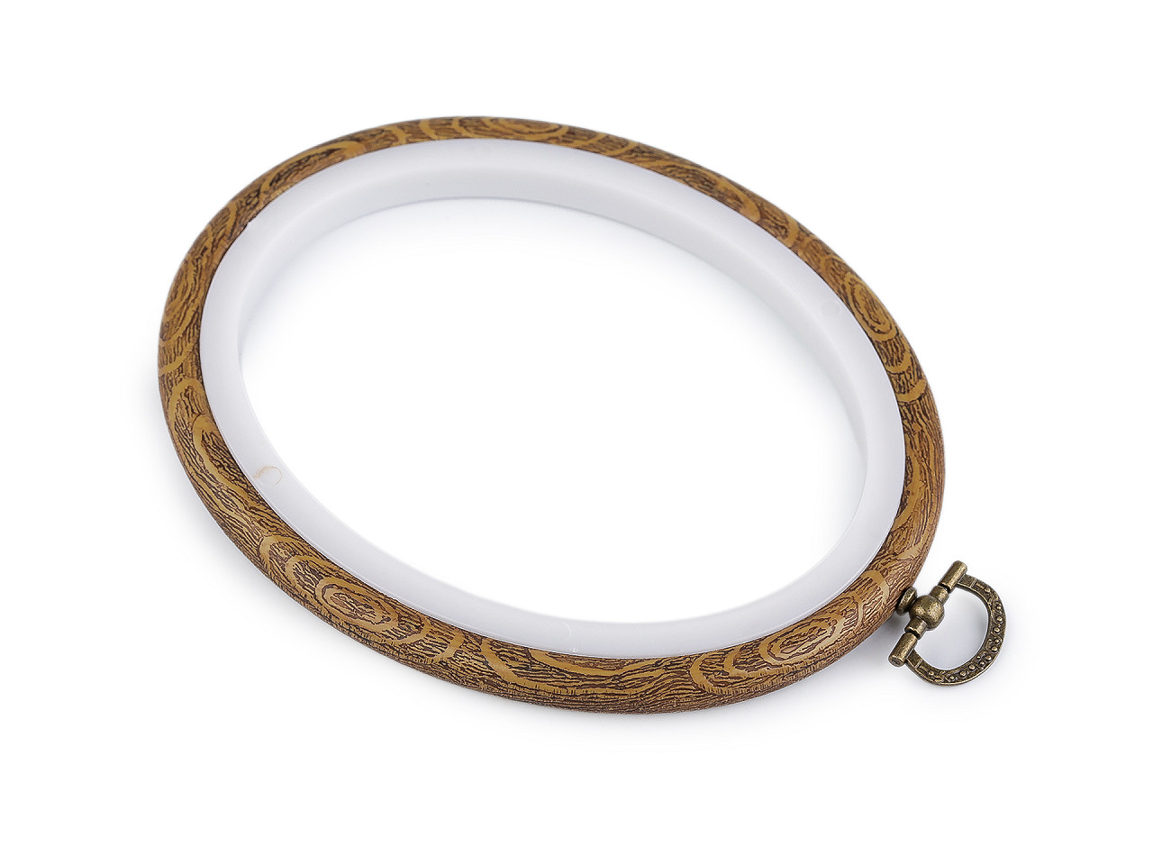 Na vyšívací ovál prichytíte látku, na ktorú budete vyšívať obrázok. Skladá sa z plastu a gumy, ktorá imituje drevo. Rámček je doplnený kovovým šrobikom, pomocou ktorého ho môžete zavesiť na stenu.