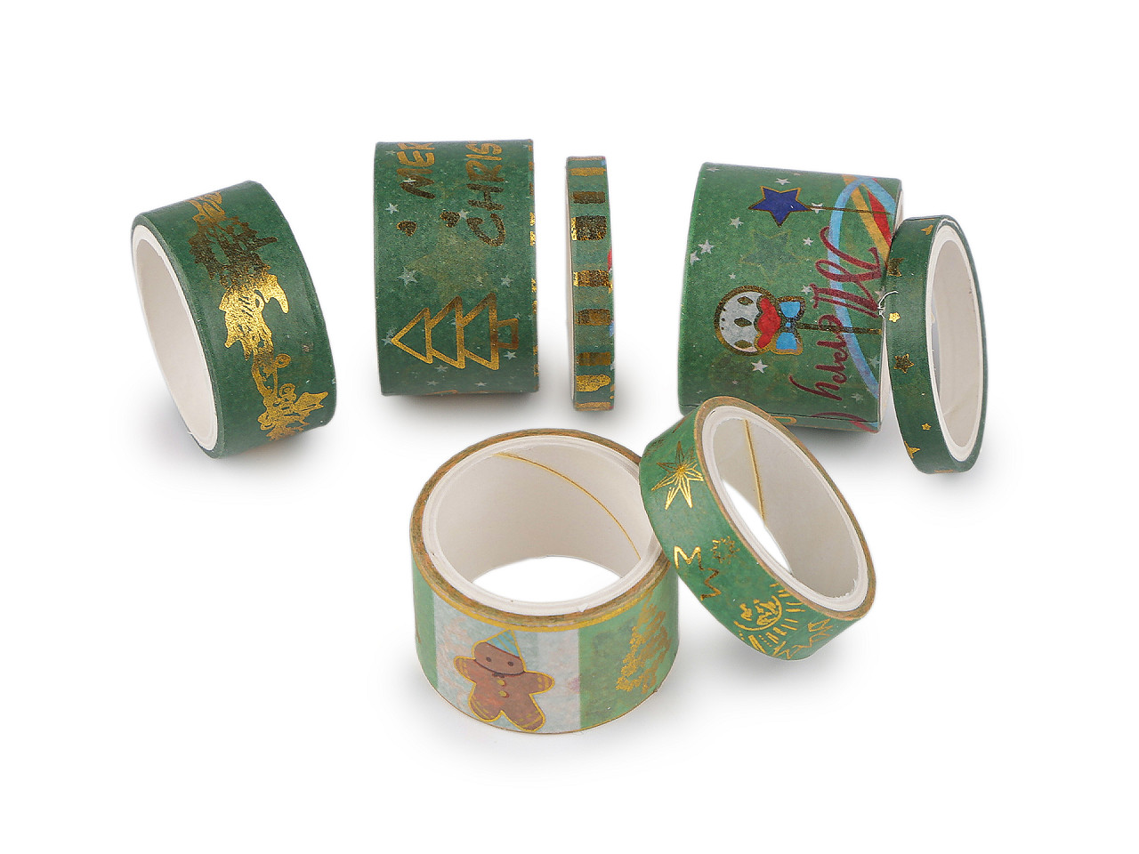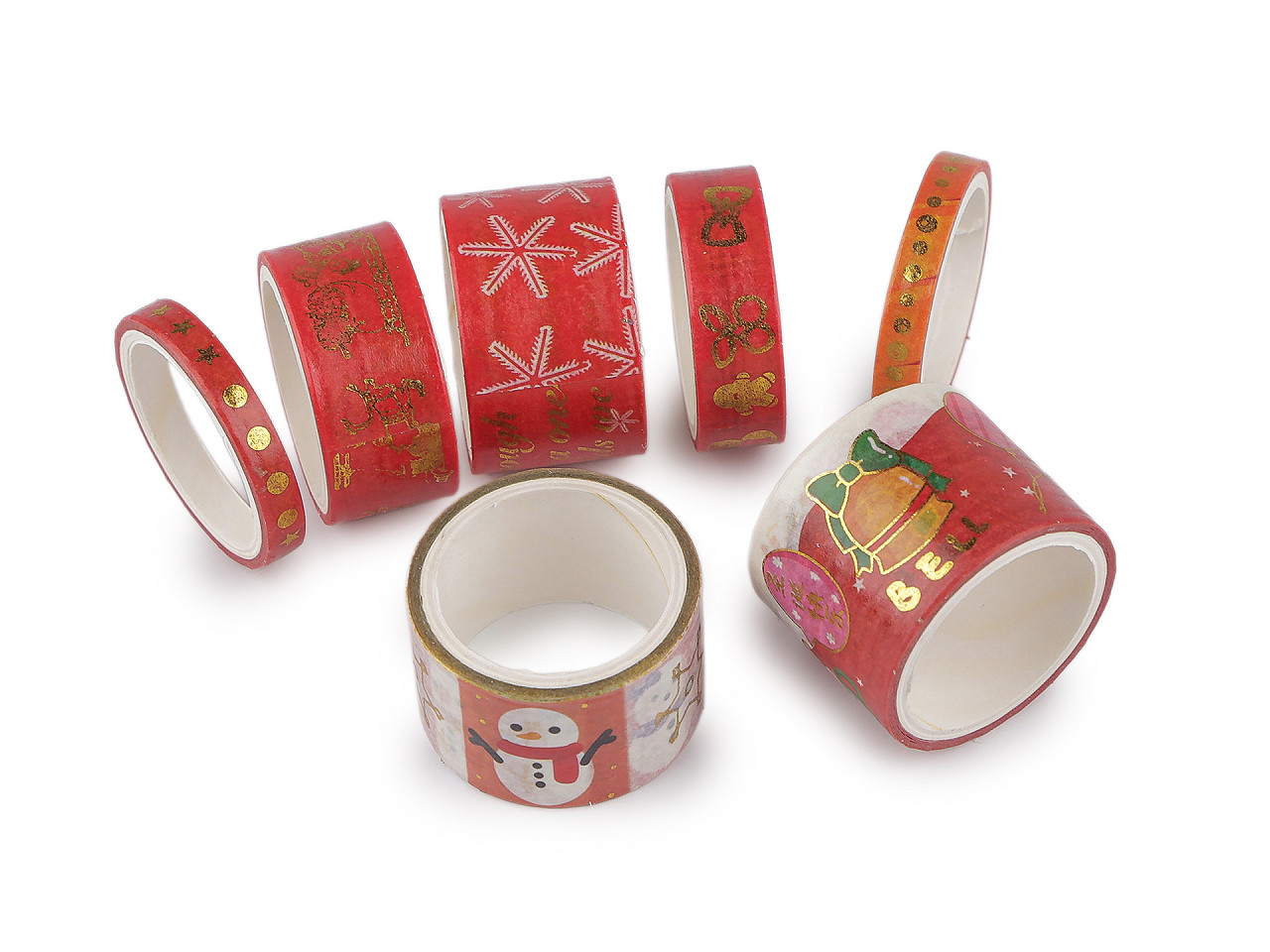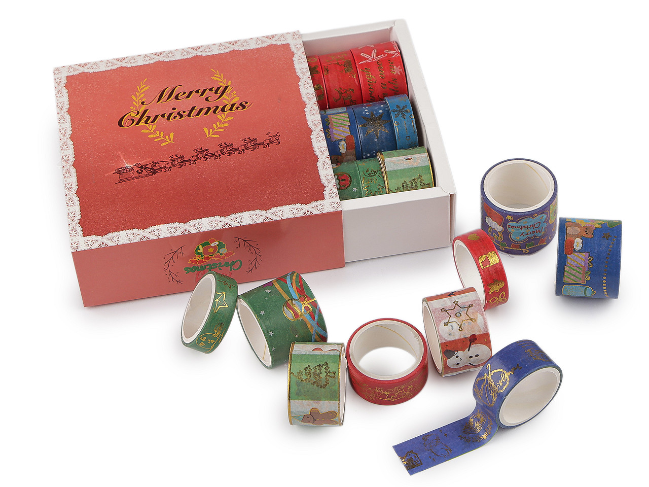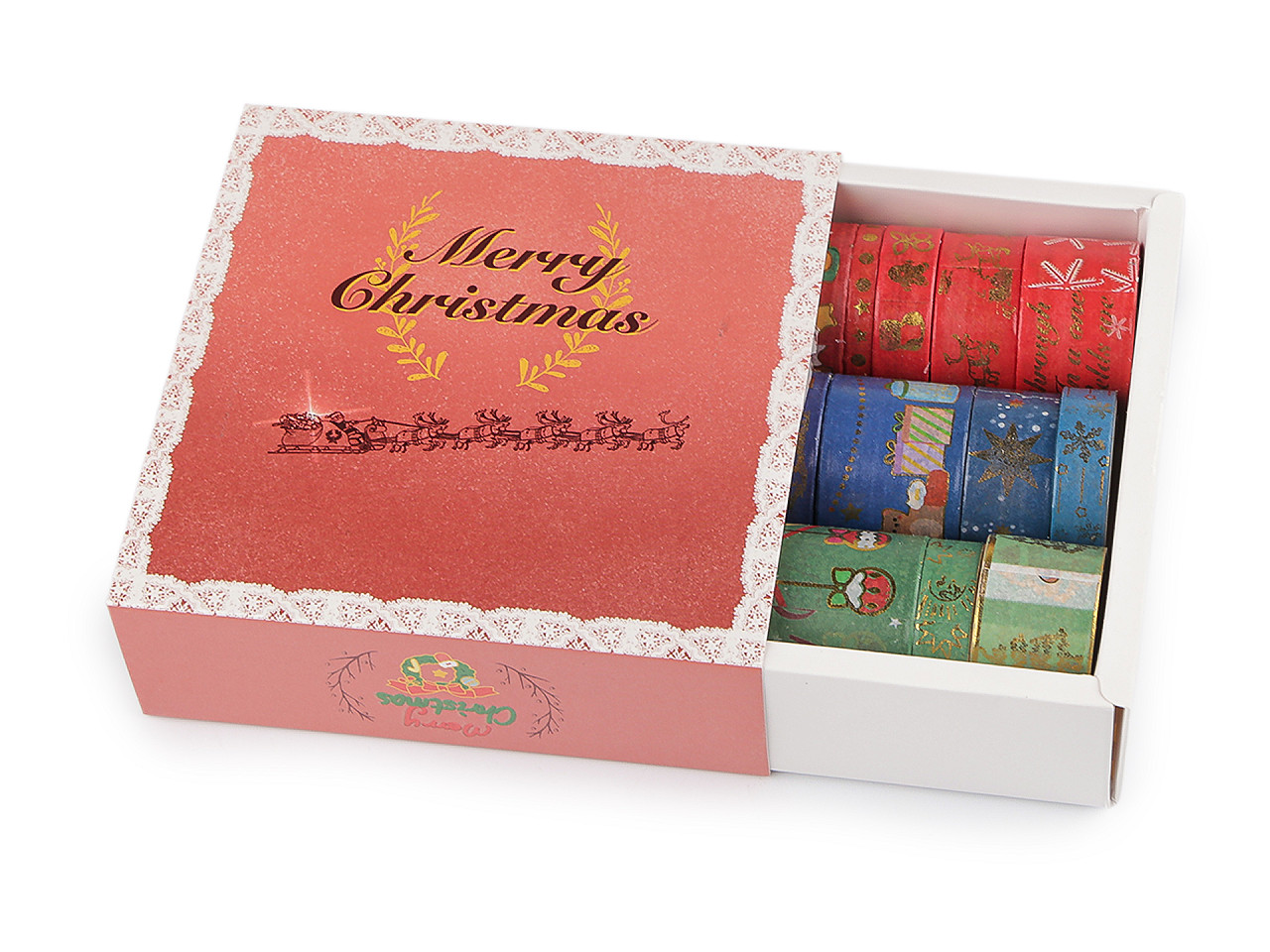 Sada washi vianočných lepiacich pásiek prinesie sviatočné kúzlo do každého detailu vašej vianočnej výzdoby. Je ozdobená lesklými metalickými detailami , využijete ju na všetkých hladkých materiáloch, ako je drevo, plast, papier, sklo, atď. Môžete s ňou ozdobiť darčeky a krabičky či ich nalepiť na priania, albumy, fotorámiky, do diára a pod. Výhodou pásky je, že je z papiera a môžete ju ľahko odtrhnúť. Vďaka samolepiacej vrstve je veľmi ľahko použiteľná a nezanecháva stopy po odstránení. Sada obsahuje rôzne šírky pásiek , v sade je 6 - 7 ks. Každý kotúčik obsahuje cca 1,8 m pásky. Mix všetkých farieb je zabalený v papierovej krabičke , bude aj krásnym darčekom. Krabička má rozmery 11 x 11 x 3,5 cm.