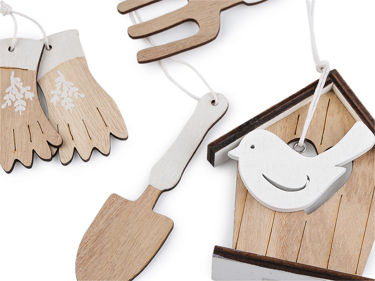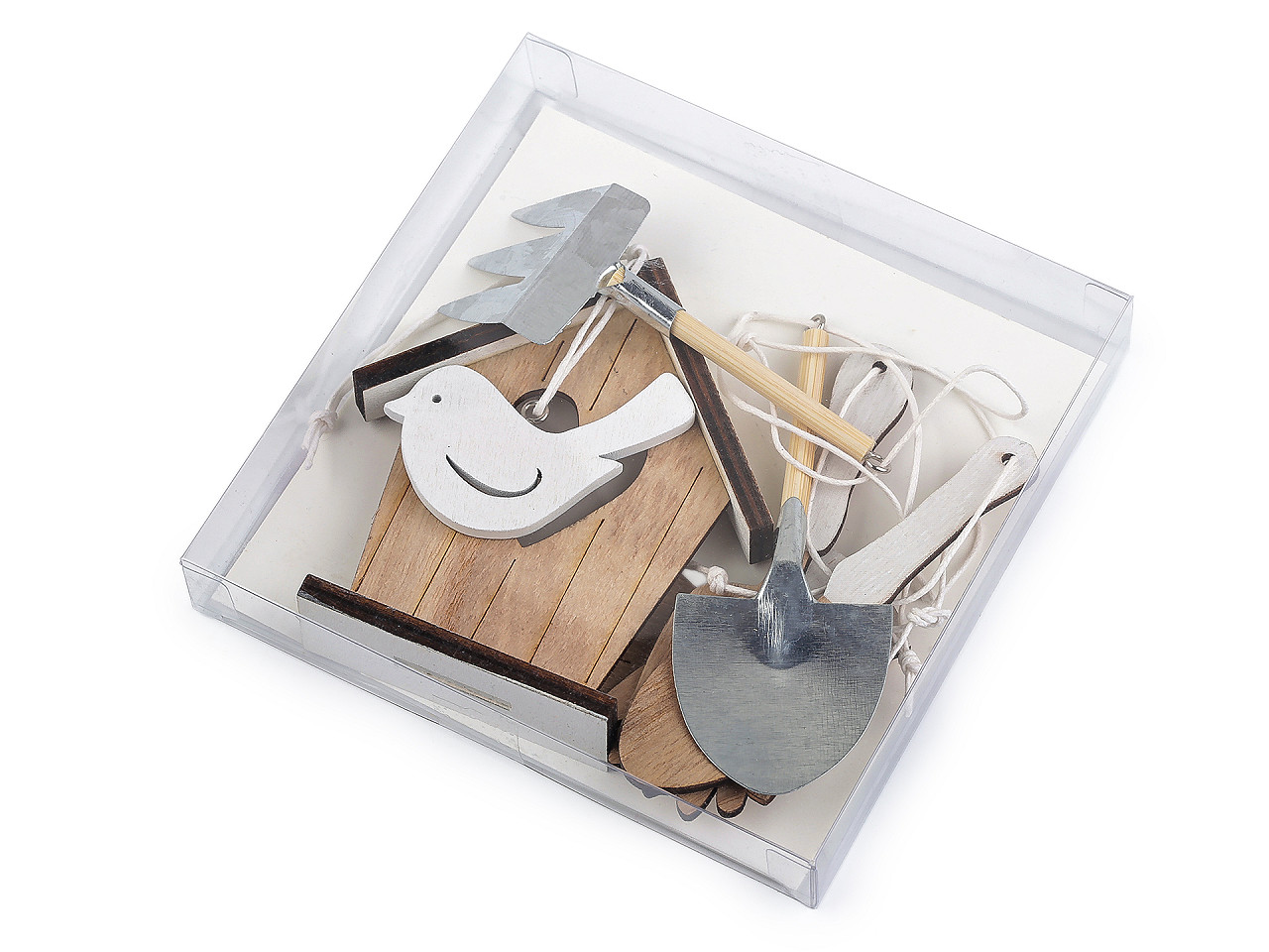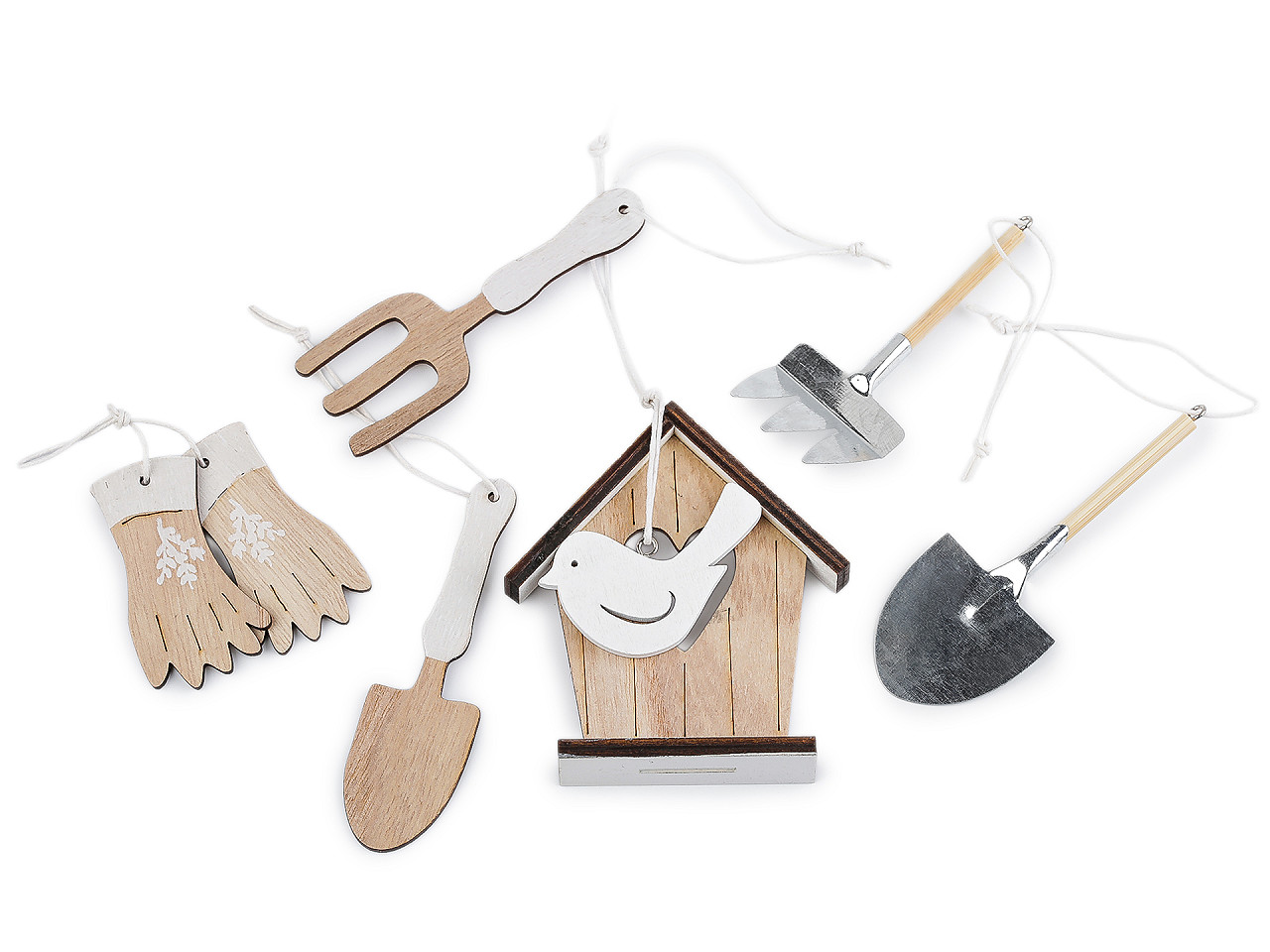 Ak milujete záhradkárčenie, tak vám nesmú chýbať miniatúry záhradného náradia , ktoré využijete na aranžovanie. Dekoráciu môžete vďaka pútku kamkoľvek zavesiť - na vence, vetvičky vo váze, možno z nich urobiť girlandu a pod. Hodia sa tiež na tematickú záhradnú párty.